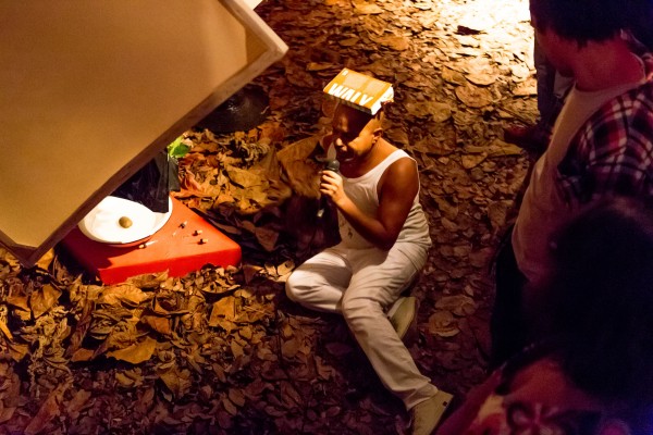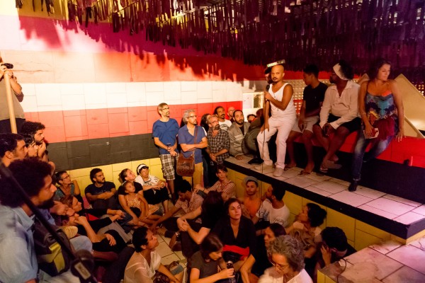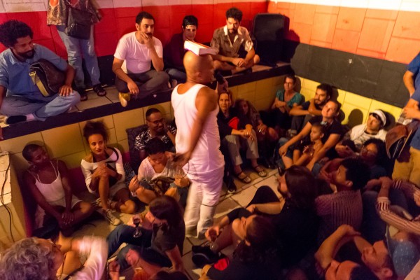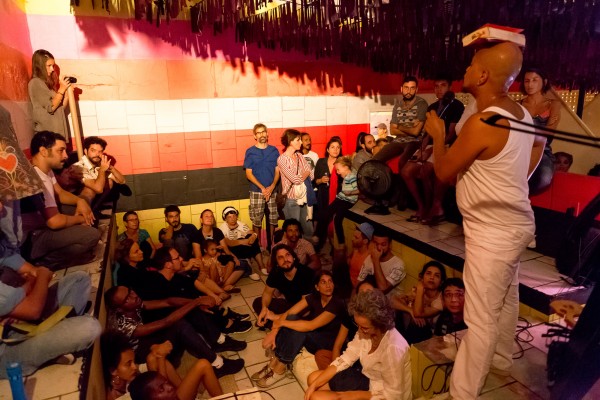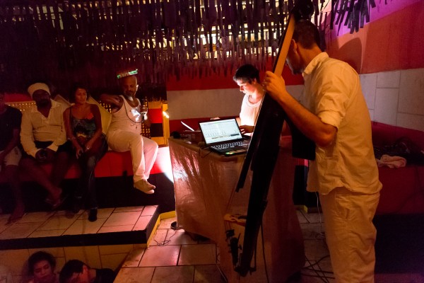 During our residency at Vila Sul in Salvador we performed a colaboration with Alex Simoes. He had developed a performance about the brazilian poet Waly Salomao where e uses the rythmic and sound of voice. In our collaboration we expanded the acoustic possibilities where I sampled, transformed and interfered using only Alex voice as music material and Klaus the doublebass.