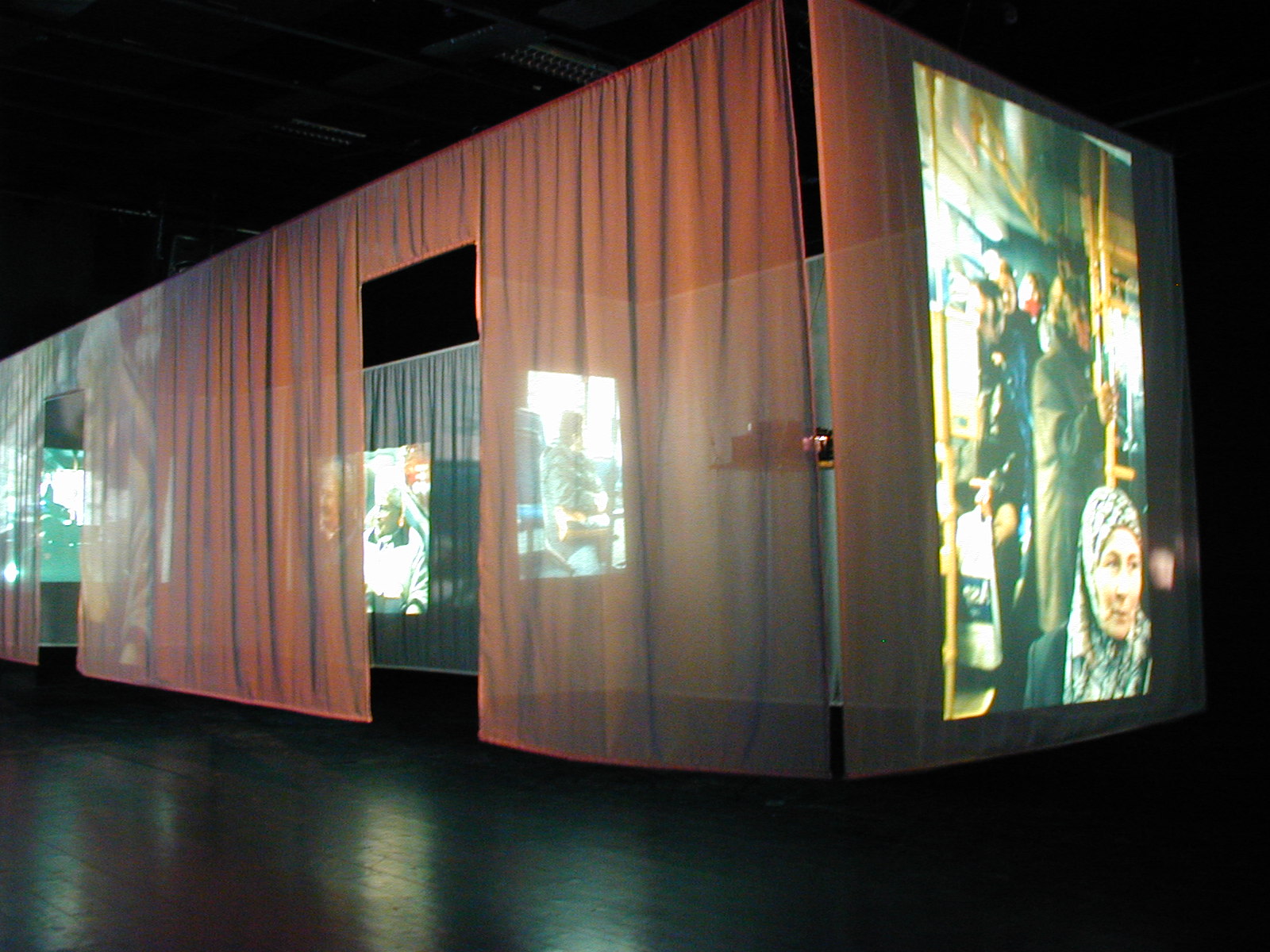 Der Stattbus ist ein aus durchsichtiger Gaze abgehängter Raum in den Maßen, die an einen städtischen Bus erinnern. Jedoch stellt dieser sich, im Gegensatz zu den uns alltäglichen Bussen, als über dem Boden schwebendes leicht-luftiges Objekt dar. Auf die Gaze werden Bilder projiziert, die Szenen aus Bussen festhalten, die Situation bei jedem neuen Bild verändern und bei denen sich manchmal merkwürdige Überschneidungen auftun, wenn unterschiedliche Bilder sich durch die durchsichtigen Wände übereinander legen.